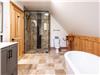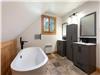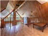 À l'étage, la mezzanine ouverte constitue un espace parfait pour la lecture ou la détente avec vue panoramique. On y trouve également deux chambres avec vue sur le lac, ainsi qu'une salle de bain élégante avec bain autoportant, douche en céramique et double vanité.