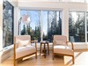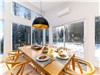 Dès l'entrée, la lumière capte l'attention. Les grandes fenêtres couvrent toute la surface des murs de la devanture et donnent à la forêt un rôle central dans l'expérience. Les saisons défilent comme un film en continu, directement du salon.