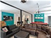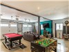 Downstairs: Large open-concept living room with sectional leather sofa, pool and soccer tables, large flat-screen television, wood stove and stainless steel refrigerator / 1 bedroom with 2 queen-size beds / 1 bedroom with queen-size bed.