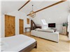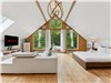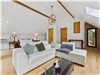 Large living room with cathedral ceilings and wood-burning fireplace