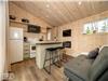 Main floor: Fully equipped kitchenette, open-concept dining and living area, bathroom, and one bedroom with a Queen bed.