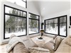 The bay windows frame the forest, transforming each window into a living painting.