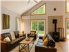 Large windows and two patio doors flood the space with natural light, offering a soothing view of the forest.