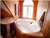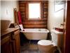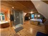 Additionally, there is a fully-equipped, charming kitchen with red ceramic tiling and a dinning room perfect for a meal à six, or eight, or ten...you decide. On this floor, you will also find a second bathroom with a claw-foot bathtub aligning the lovely round logs of the outer wall.