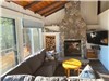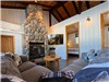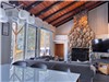 • Salon : Aire de vie à aire ouverte avec foyer en pierre et vue sur le lac