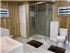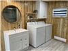 salle de bain avec douche , séchoir à cheveux , laveuse/sécheuse.