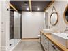 Rez-de-chaussée : Salon, cuisine, salle à manger, salle d'eau, chambre avec lit Queen et douche.