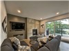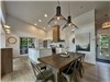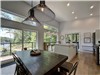 The kitchen, with its central island and café-style counter by the window, is perfect for impromptu meals and morning coffee by the lake. Large windows blur the line between indoors and outdoors, allowing nature to become part of the decor.