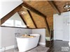 Upstairs: Open plan bedroom # 2 with 1 Queen Bed, freestanding tub and view of Grand Lac-François and the sunset / Patio door on the 2nd floor with a rooftop terrace designed to admire the view of Grand Lac St-François and the sunset / Half bathroom